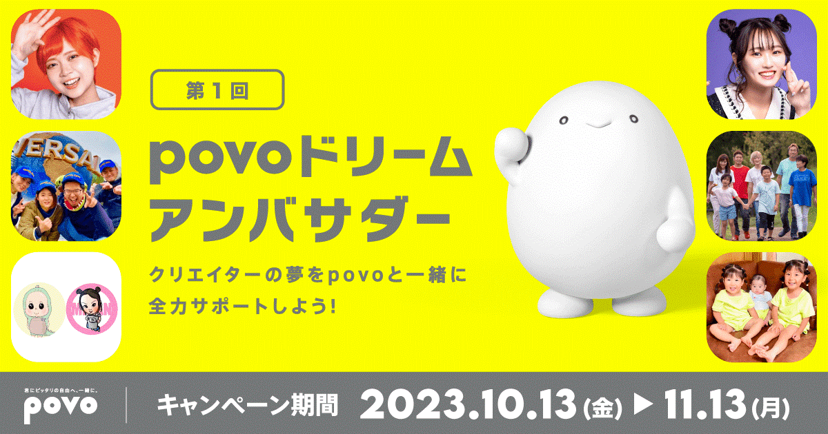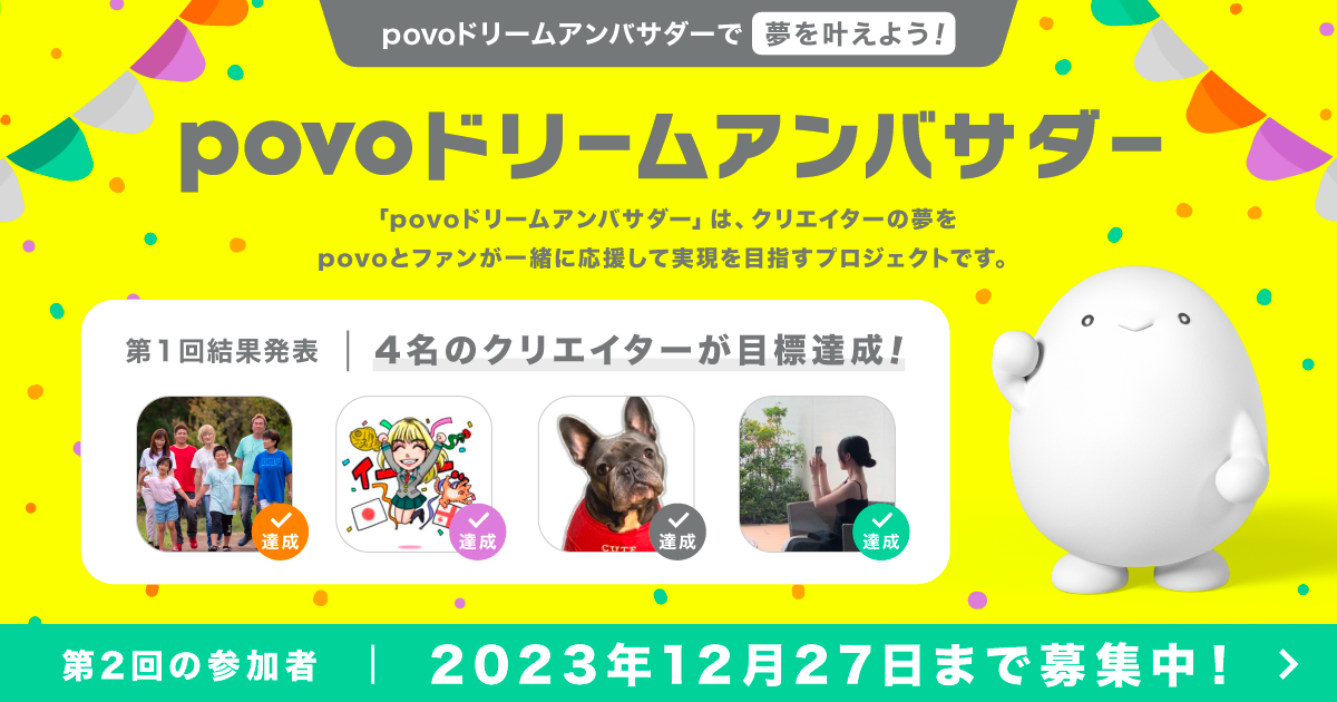 好評だった第1回に続き、2024年上旬には「第2回povoドリームアンバサダー」の開催も決定しました。周囲(応援してくれる家族やファン)に恩返しをするような夢を抱えているクリエイターは、2023年12月27日までの期間、応募フォームよりご応募いただきますと、審査の上、「第2回povoドリームアンバサダー」への参加が可能になります。ご自身の夢を叶える絶好のチャンスとなります。みなさまのご応募をお待ちしております。