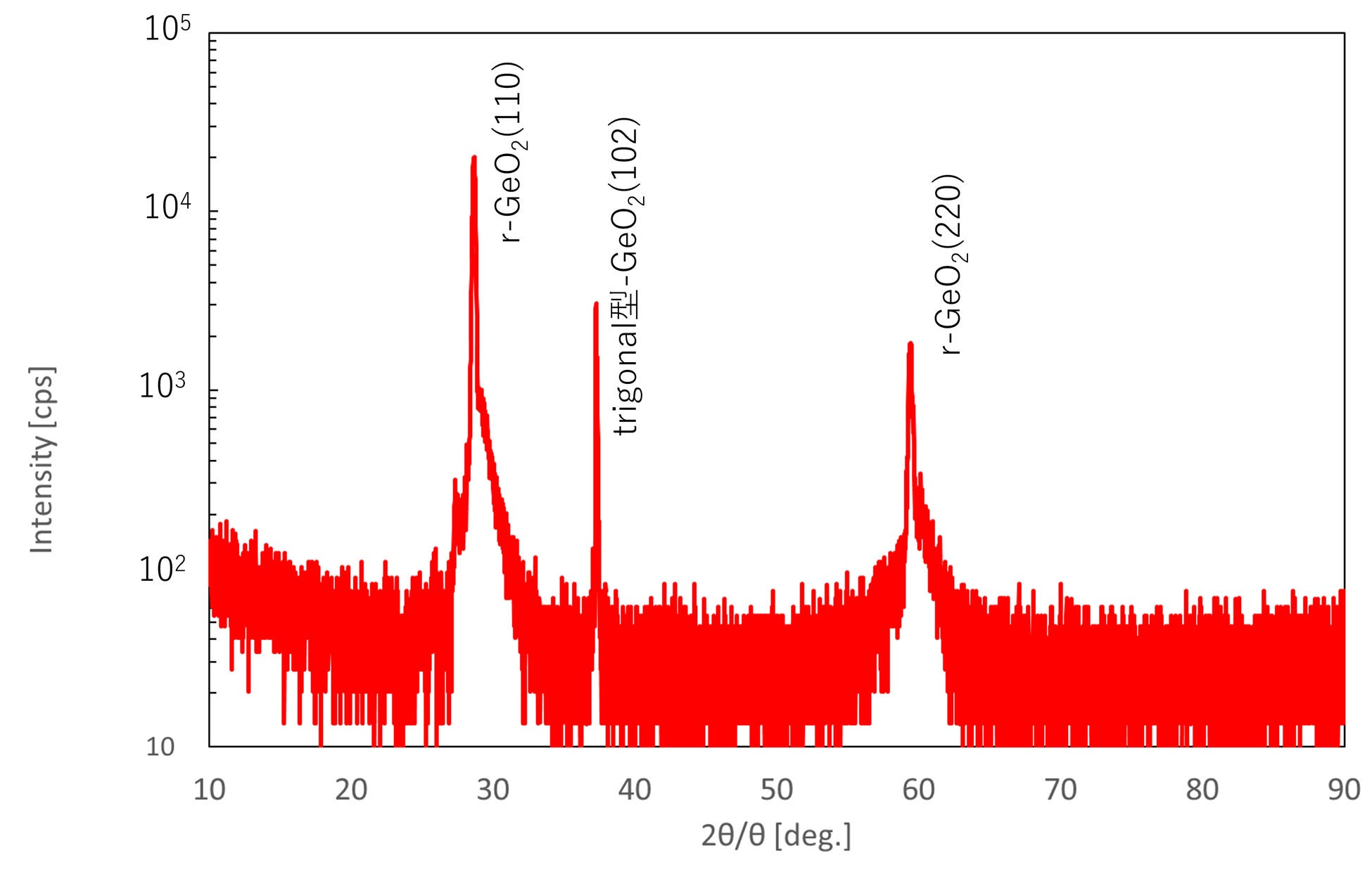 従来のFlux法で合成したr-GeO₂バルク結晶を種結晶として、FZ法によりr-GeO₂の結晶育成に世界で初めて成功しました。図1に示す結晶の左側黒色部分がFZ法によって育成された結晶で、約5mmの大きさを実現しています。育成された結晶部分は、添加物によって黒色を呈していますが、その側面にはファセット面(結晶面)が確認でき、高い結晶性が示唆されます。側面のファセット面をX線回折測定法で評価したところ、ファセット面はr-GeO₂の(110)面であることが確認されました(図2)。また、黒色の育成部を粉末にし、X線回折測定で評価したところr-GeO₂の結晶ピークを確認できました。一方で、ルチル型とは異なる結晶相であるtrigonal型GeO₂の結晶ピークも確認されており、育成された結晶にはルチル型とは異なる結晶相が一部含まれることが分かりました(図3)。