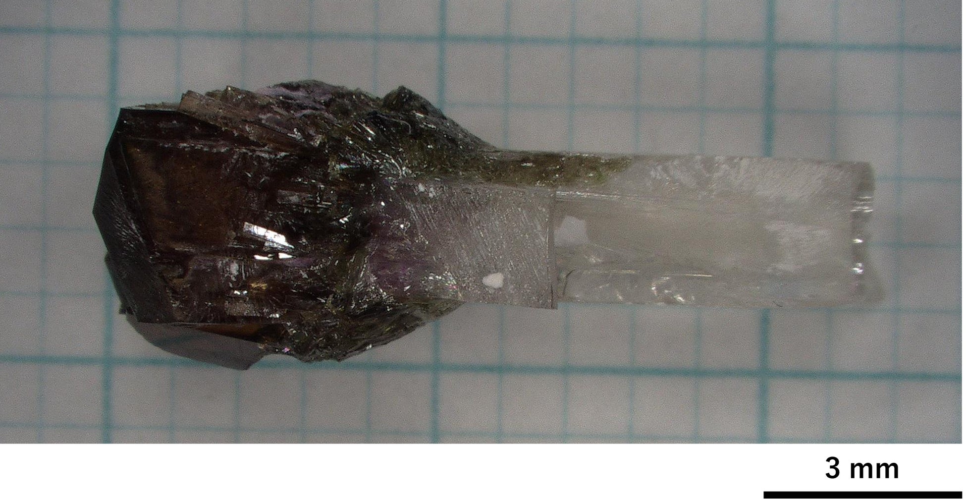 (左側の黒い部分がFZ法で育成した結晶、右側の白い部分はFlux法で合成された種結晶)