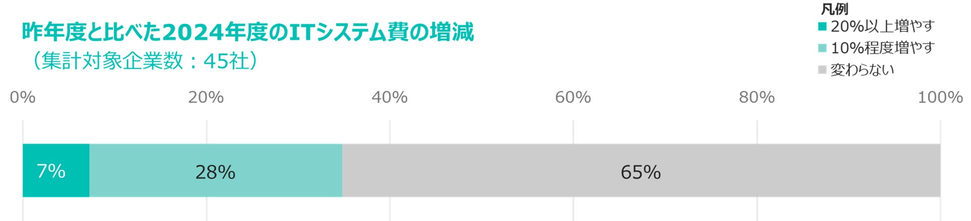 ・昨年度と比較して、2024年度のITシステム費を増やす企業は約4割。減らす企業はいなかった。
