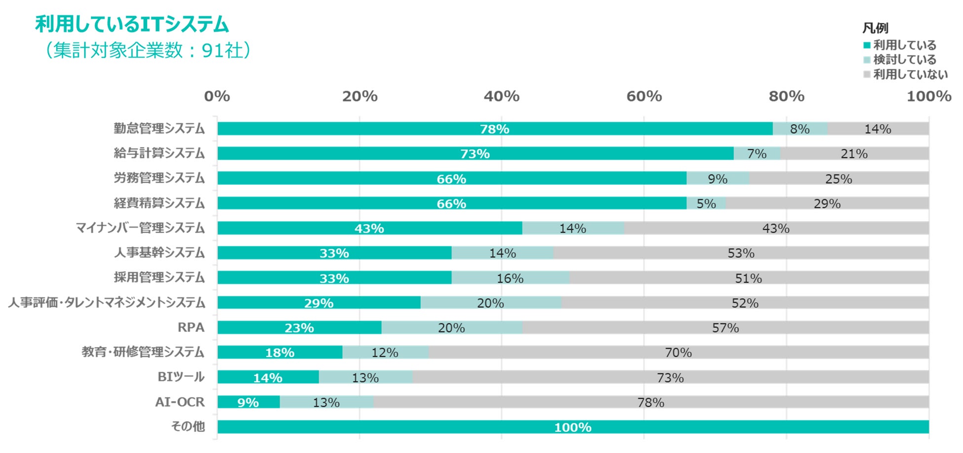 ・人事部門で利用しているITシステムは、勤怠管理、給与計算が7割を超え、上位となった。