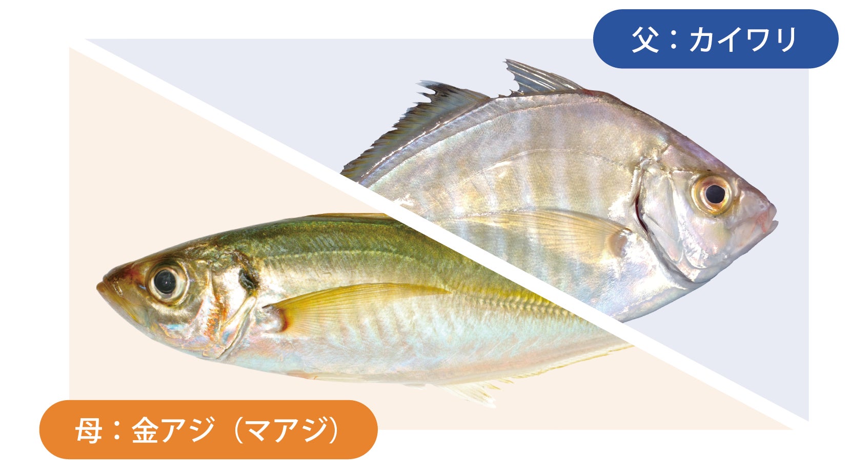 世の中に存在する天然信仰を打破するような、圧倒的に美味しい養殖魚を世に届けたいという思いから、さかなドリーム共同創業者 / 東京海洋大学 教授の吉崎悟朗は、人生で最も愛する魚「カイワリ」に注目しました。「カイワリ」は豊洲市場の仲買人から最も人気がある魚の一つですが、不安定な漁獲量と養殖の難しさから、一般市場に流通することはほとんどありません。そこで、養殖技術が既に確立されている「マアジ」を片親に用いたところ、抜群の美味しさと飼いやすさを併せ持つ新たな魚が誕生しました。