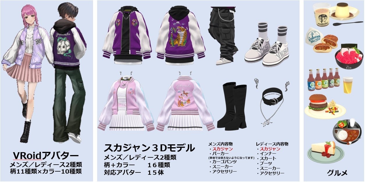 同時に、オリジナルアバターや、様々な人気アバターに対応したオリジナルスカジャン3Dデータを公式サイトとBooth(※)にて無償配布いたします。ぜひ様々なコーディネートでお楽しみください!