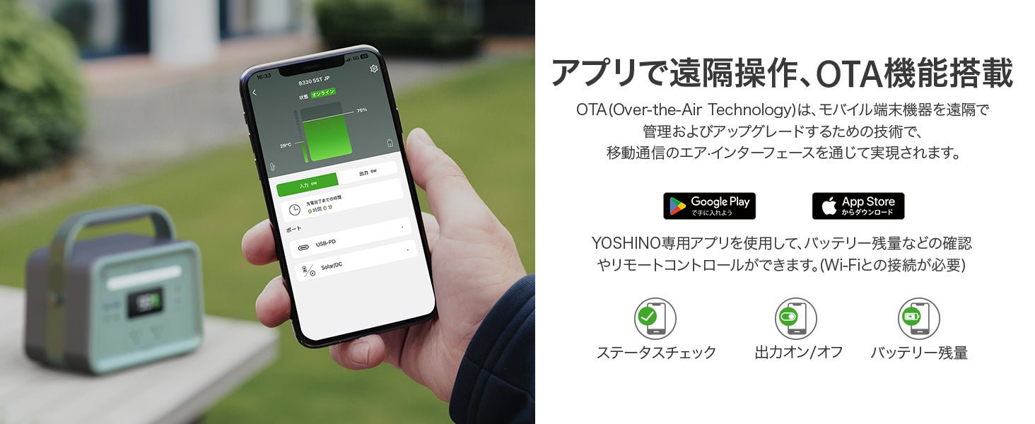 専用アプリを使えば、スマートフォンの画面でバッテリー残量や使用状況などを簡単に確認できます。また、OTA(無線ファームウェア更新)機能により、常に最新の機能を利用可能です。