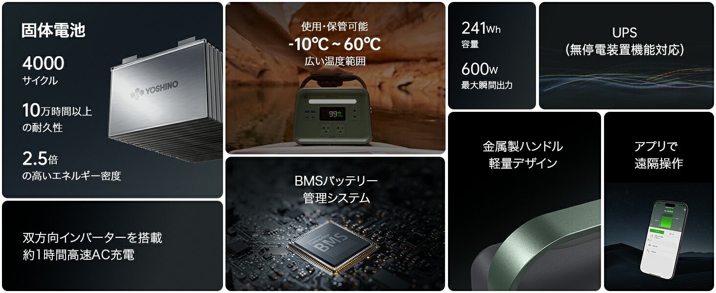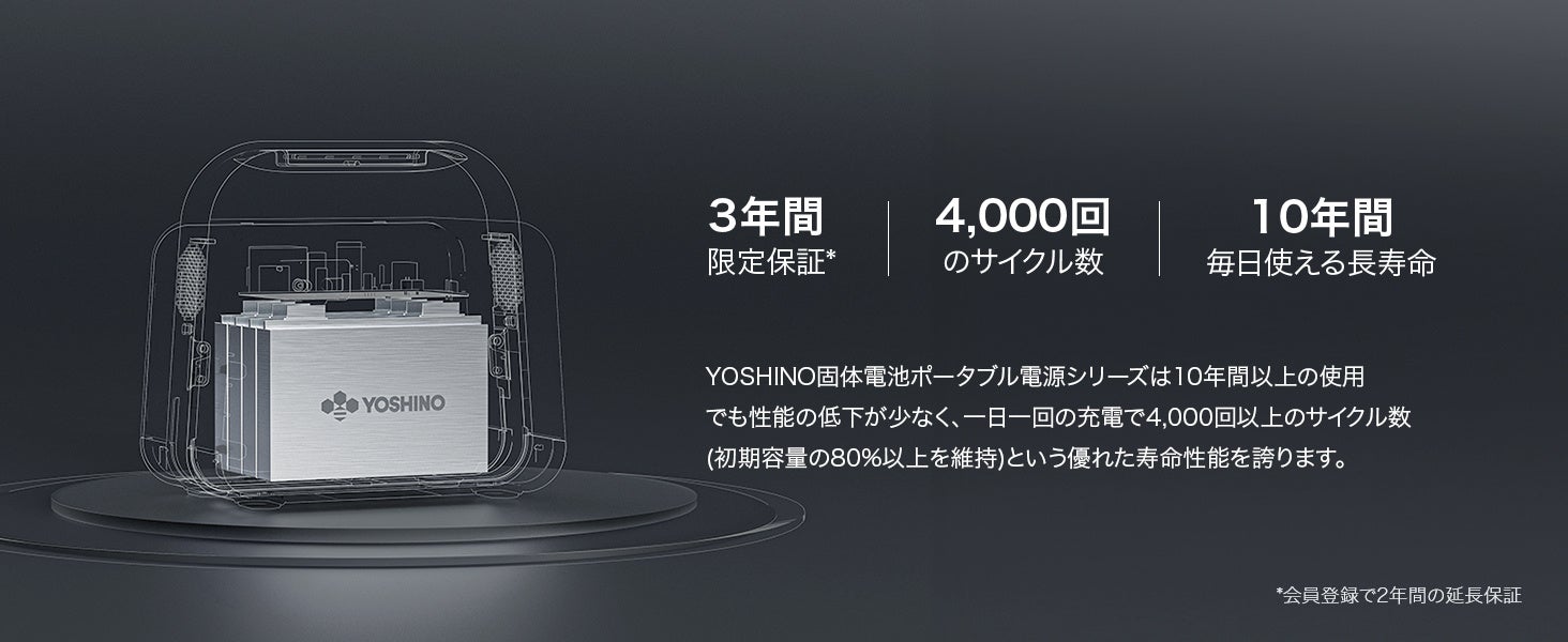 YOSHINOは、世界で初めて固体電池を搭載したポータブル電源を開発したメーカーです。私たちのビジョンは、「固体電池技術」を通じて、より効率的でスマートなデジタル体験を提供し、皆さんの日常をアップグレードすることです。2021年にアメリカで創業し、その後、固体電池の技術開発や、さまざまなシーンで使えるデザイン、安全性の追求を進め、2023年から固体電池を採用したポータブル電源を販売しています。