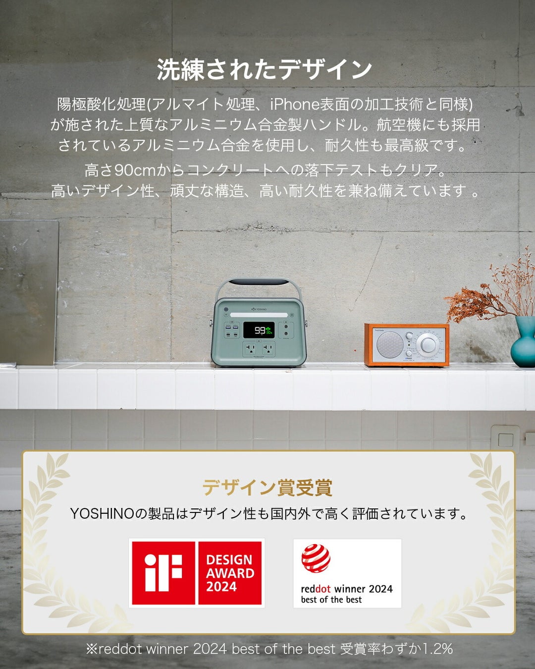 このヨシノのポータブル電源は米国のデザイン事務所であるFuseProjectによってデザイン。洗練された外観と柔らかい配色によって、リビングに置いておいてもインテリアに溶け込むデザインに仕上がっています。iF DESIGN AWARD 2024やレッド・ドット・デザイン賞を受賞するなど、デザイン性の高さも国内外で評価されています。