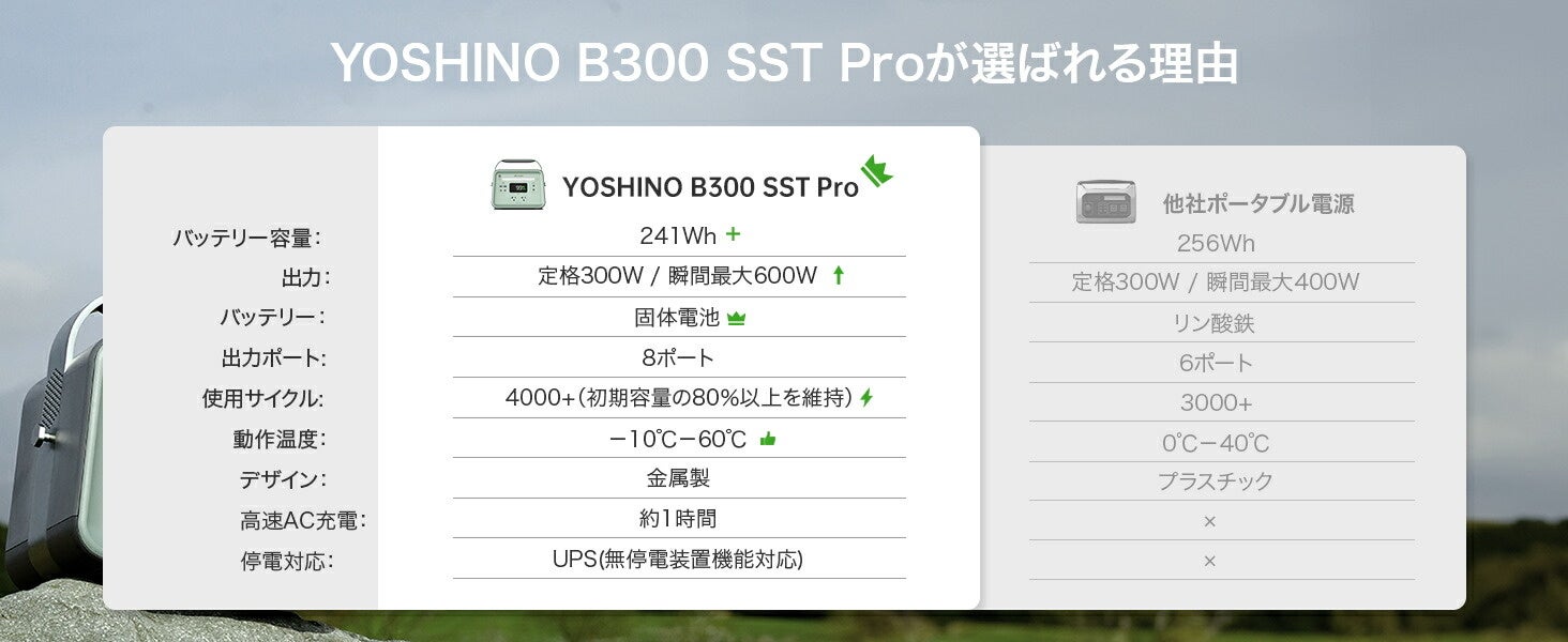 株式会社ヨシノパワージャパン(以下「ヨシノ」)は、革新的な技術を搭載した新製品「YOSHINO B300 Pro 固体電池ポータブル電源」を発表いたします。YOSHINO B300 SST Proは、ヨシノでこれまで販売してきた、固体電池を手軽に体感できることで大人気だった小型モデルB300 SSTのグレードアップ版です。