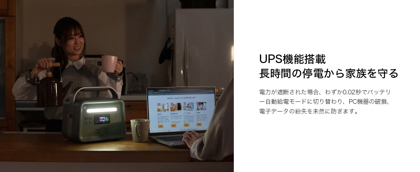 YOSHINO B300 Proは、単なるポータブル電源ではありません。オフグリッド型UPS(無停電電源装置)機能を搭載しており、停電や電圧の変動が発生した場合でも、わずか0.02秒でバッテリー給電に自動で切り替わります。