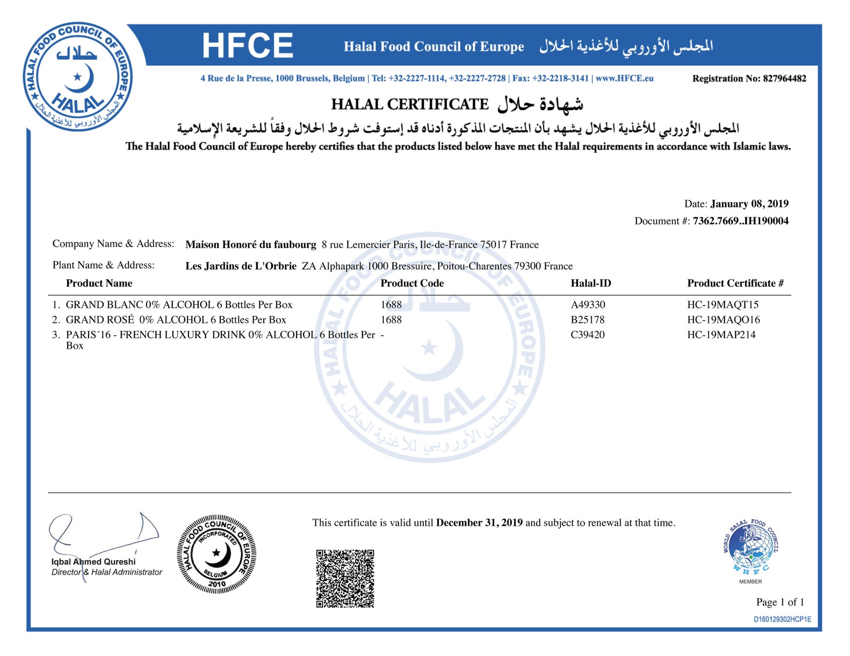 フランス製ノンアルコール・スパークリングの【1688 Grand Rosé ,1688 Grand Blanc, Paris’16 Blanc】は、欧州圏でのHALAL認証と、マレーシアHALALの認証も受けている飲料です。イスラム圏のお客様の受け入れに、ご活用いただけます。