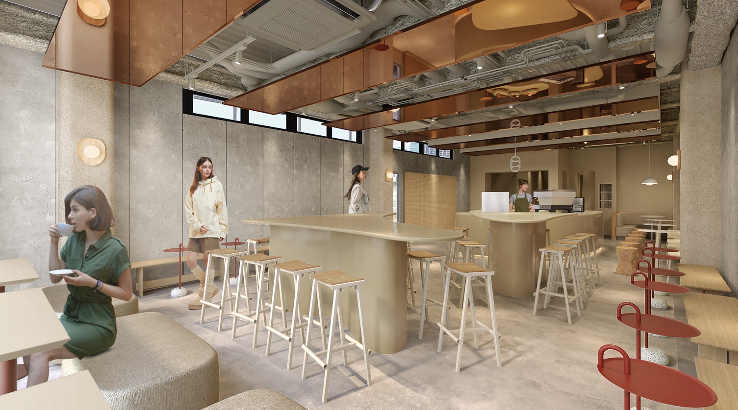 店内は、街の落ち着いた景観に溶け込む木の温もりと、都会的な洗練された雰囲気を感じさせるステンレスを融合した、自由が丘らしい上質で心地よいデザインとなっています。ダコーには広々としたイートインスペースをご用意しており、家族連れから幅広い年代の方々までゆっくりカフェをお楽しみいただける、新たな食空間をお届けします。