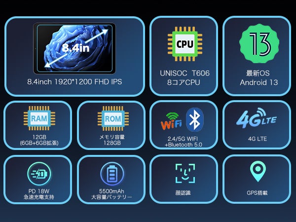 Android 13 平板电脑 8.4 英寸 FHD Incell 1920x1200IPS RAM12GB(6+6 扩展)ROM128GB 8 核 CPU Widevine L1 兼容 SIM WiFi 型号 大容量电池 人脸识别 GPS GMS/TELEC 认证 初学者儿童的完美礼物 轻薄 326g