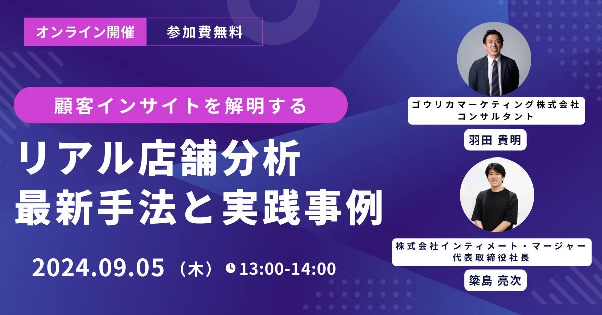 「人に寄りそう合理化」で企業変革をサポートするゴウリカマーケティング株式会社(本社:東京都渋谷区、代表取締役:岡本賢祐、以下ゴウリカマーケティング)は、9月5日(木)に株式会社インティメート・マージャ―(本社:東京都港区、代表取締役:簗島 亮次)と共同で、最新のデータ分析手法とリアル店舗の顧客インサイトを紐解く方法をご紹介するウェビナーを実施いたします。
