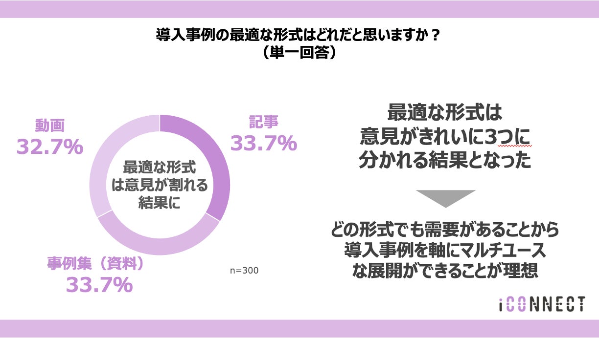 また、弊社独自の調査においても、「記事」「事例集」「動画」が導入事例コンテンツとしてほぼ均等に支持されており、マルチチャネルでの発信が有効であることが明らかになっています。