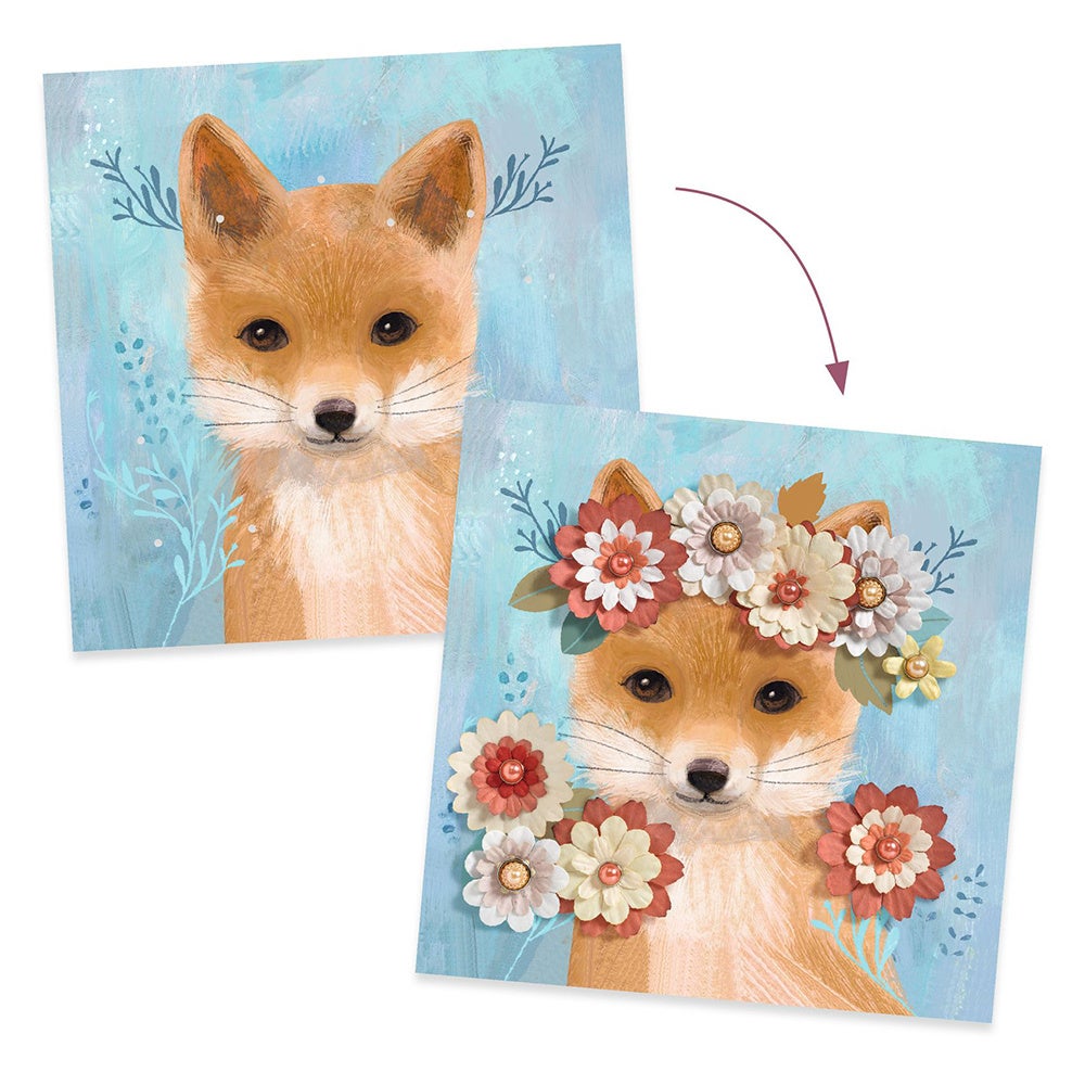 【新商品】「3Dピクチャー フローラル リース」は、動物のイラストにお花で飾り付けをするキットです。留め具にはビジューがついており、完成するときらびやかで立体感のある作品に仕上がります。