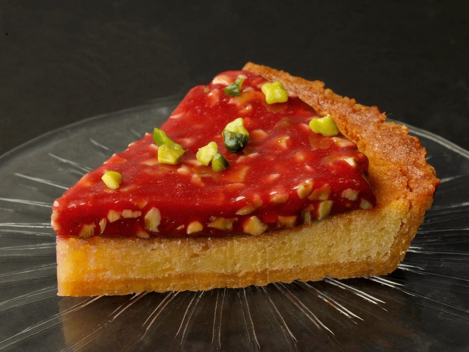 フランボワーズピューレを加えた真っ赤なキャラメルが目を惹く、見た目にも愛らしい一品。表面に散りばめたピスタチオがアクセント。華やかな香りと甘酸っぱさが口いっぱいに広がります。