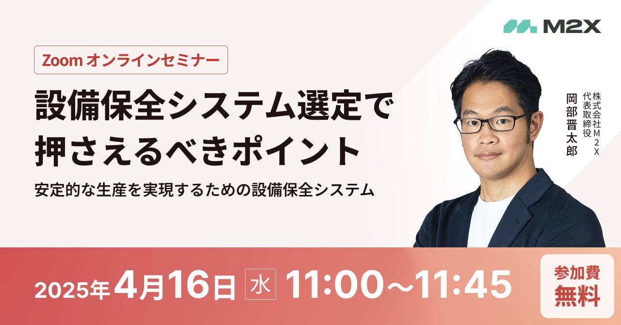 株式会社M2X(本社:東京都中央区、代表取締役:岡部晋太郎)(以下「当社」)は、「設備保全システム選定で押さえるべきポイント」をテーマとした無料オンラインセミナーを開催致します。