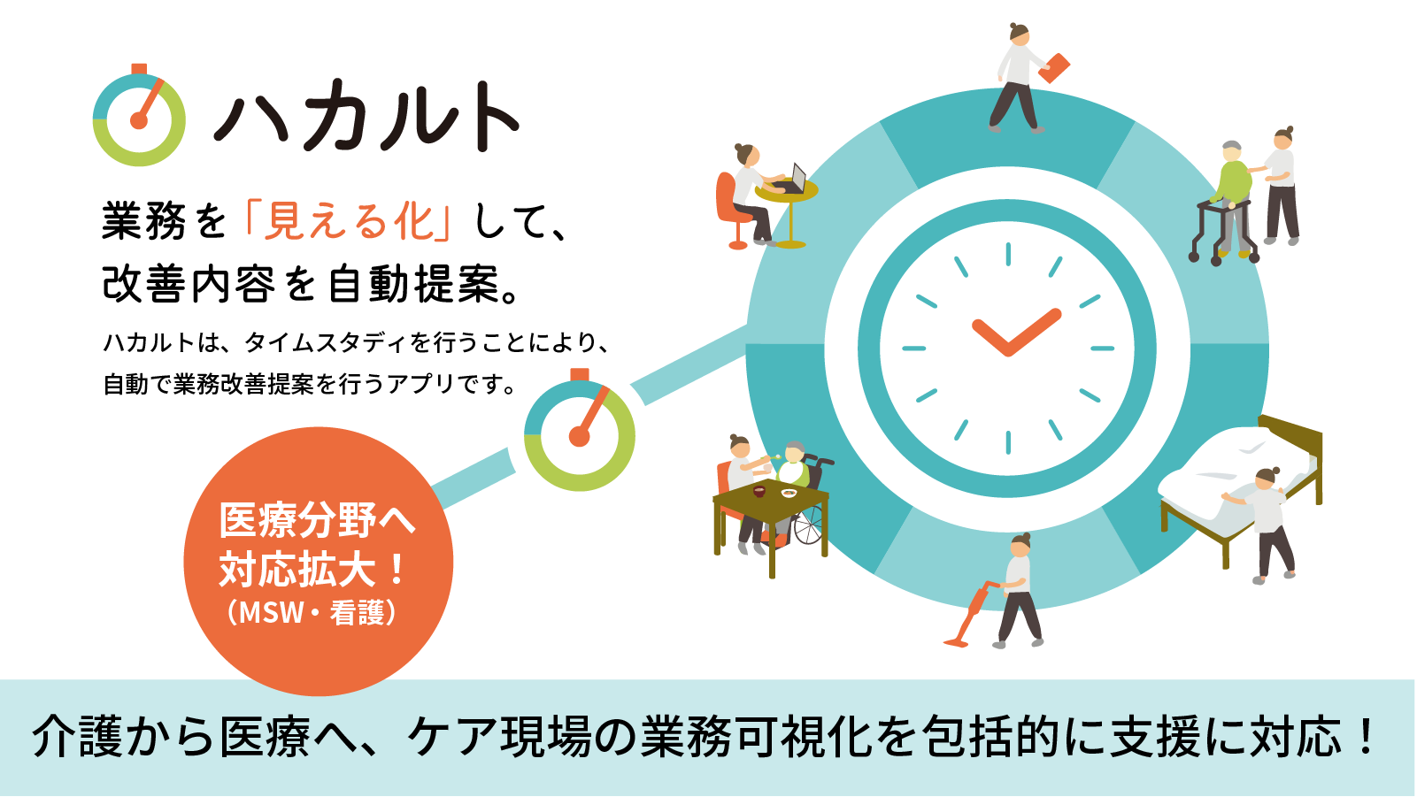 タイムスタディ調査・業務改善自動提案アプリ「ハカルト」がMSW、病棟看護、訪問看護の医療分野でのタイムスタディに対応 ~介護から医療へ、ケア現場の業務可視化を包括的に支援~