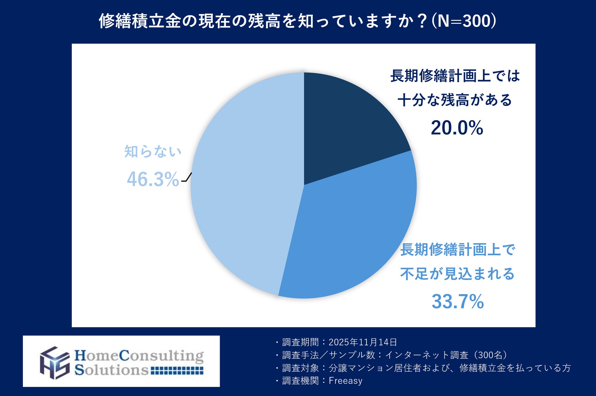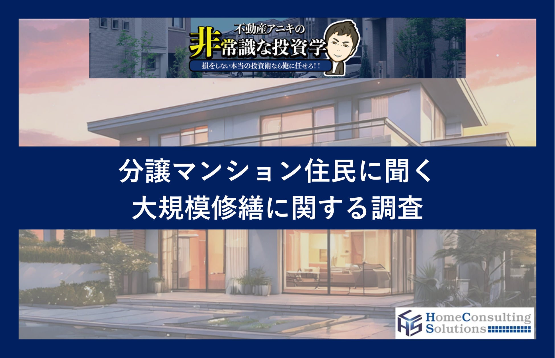 YouTubeチャンネル『不動産アニキの非常識な投資学』を運営するホームコンサルティングソリューションズ株式会社(愛知県名古屋市、代表・小林大祐)は、分譲マンションを購入・居住しており、修繕積立金を支払っている300名を対象に「分譲マンション住民に聞く大規模修繕に関する調査」を実施しました。