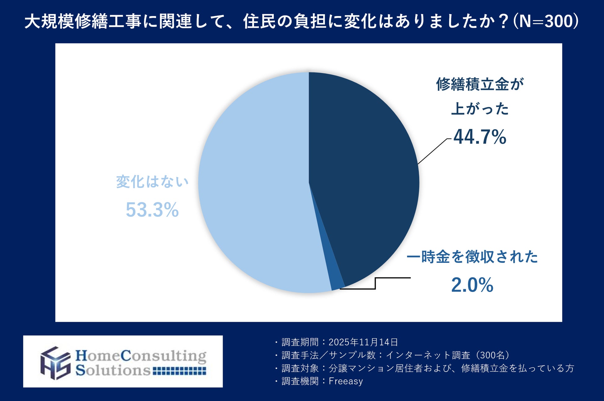 ・大規模修繕工事に関連して約45%が「修繕積立金が上がった」と回答。
