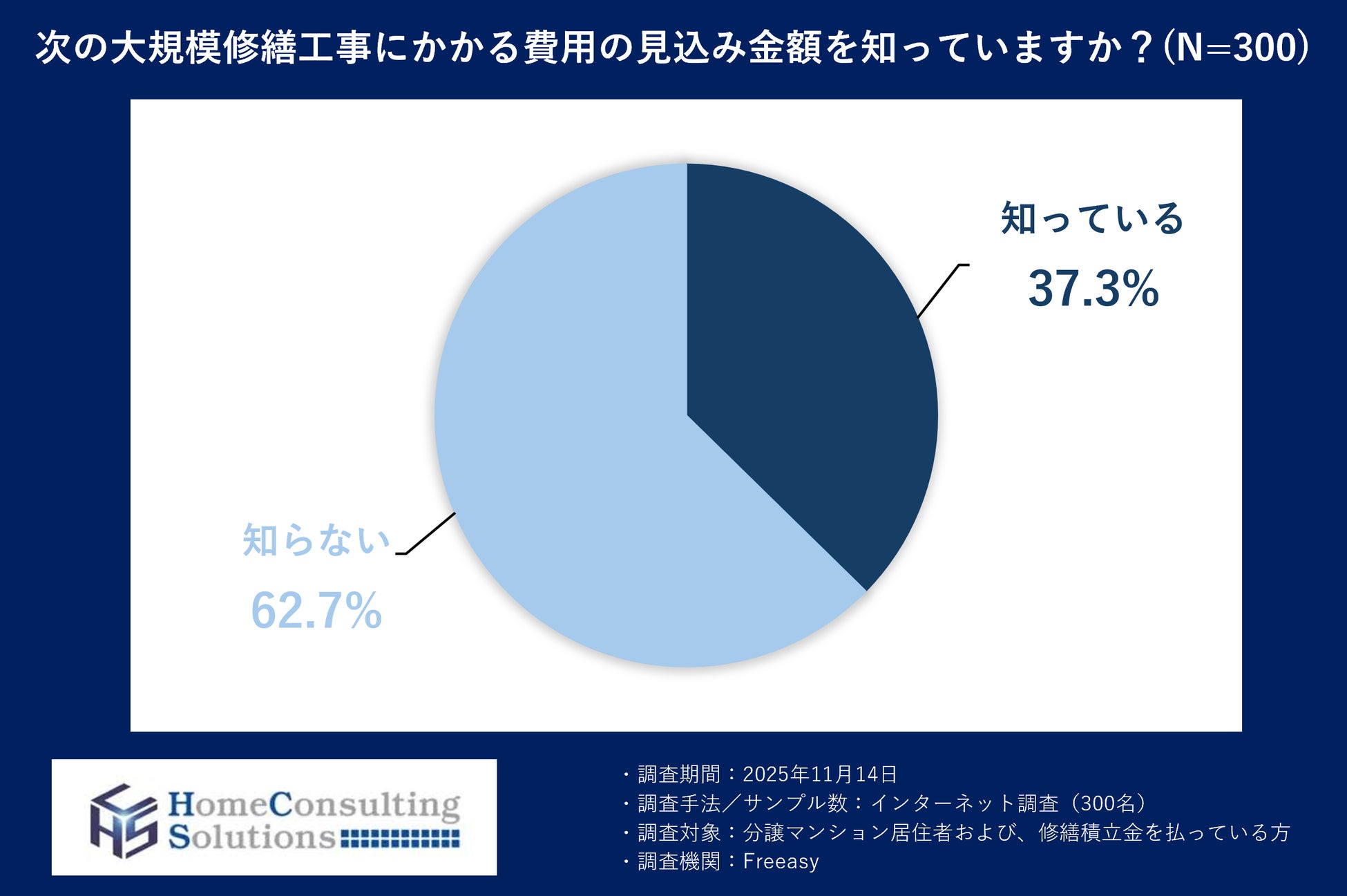 分譲マンション居住者および、修繕積立金を払っている方300名を対象に、次の大規模修繕工事にかかる費用の見込み金額を知っているか聞いたところ、6割超が「知らない」と回答しました。
