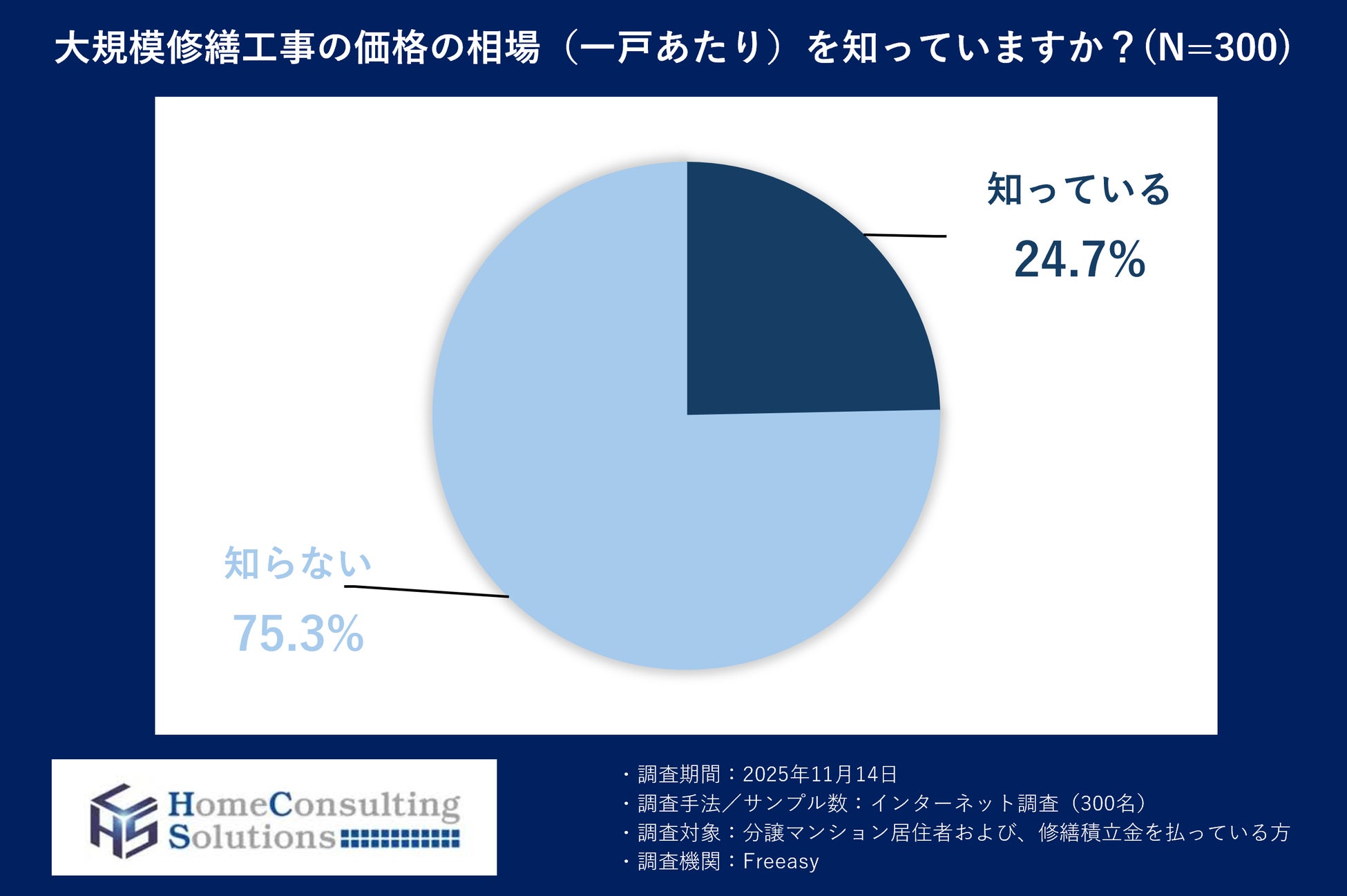 続いて大規模修繕工事の価格の相場(一戸あたり)を知っているか聞いたところ、こちらも「知らない」と回答した方が75.3%で多数となりました。
