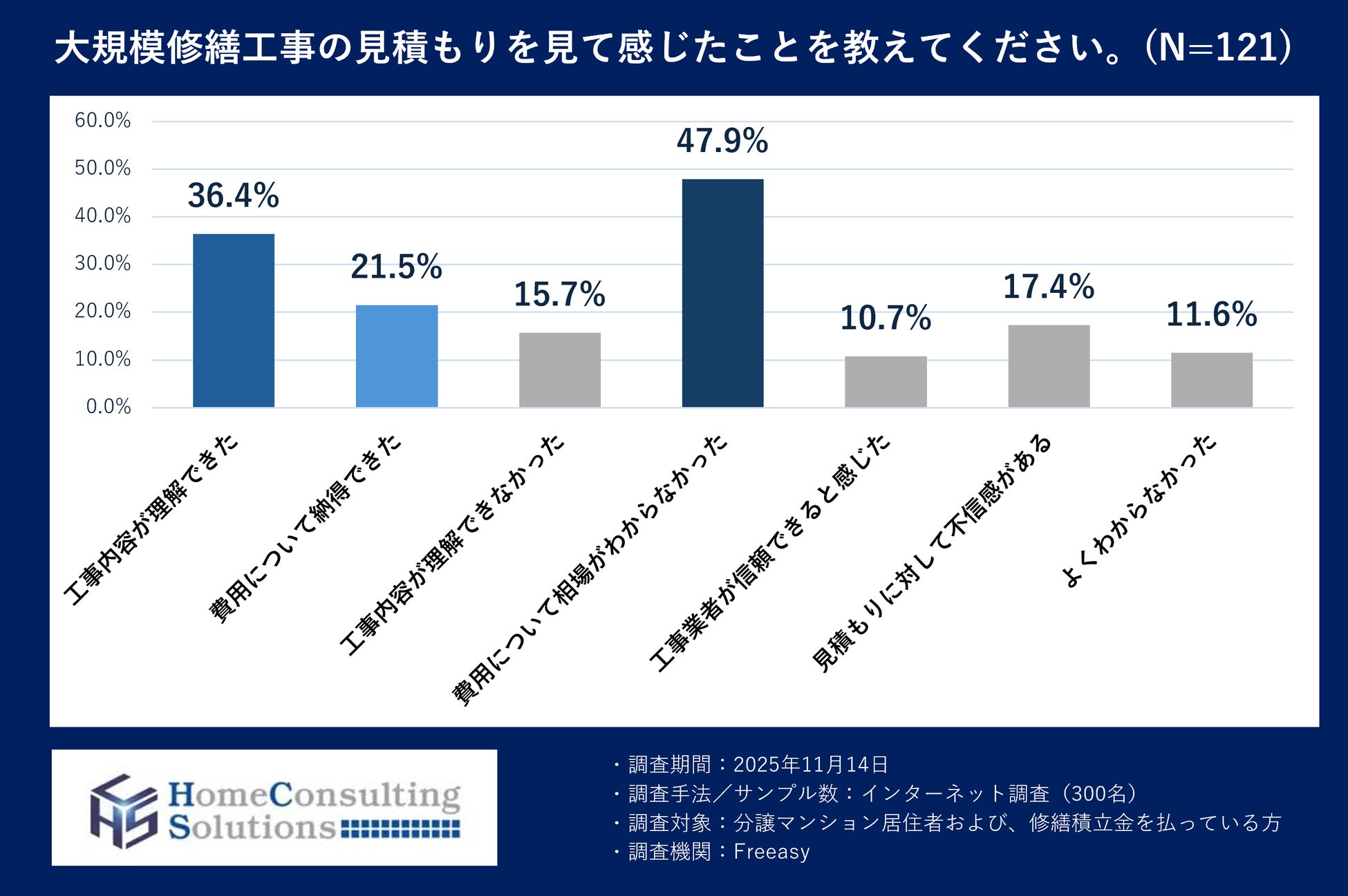 前問で大規模修繕工事の見積を見たと回答した方(121名)に、大規模修繕工事の見積もりを見て感じたことを聞いたところ、「費用について相場がわからなかった」と回答した方が47.9%でトップ、次いで「工事内容が理解できた」と回答した方が36.4%、「費用について納得できた」と回答した方が21.5%という結果となりました。