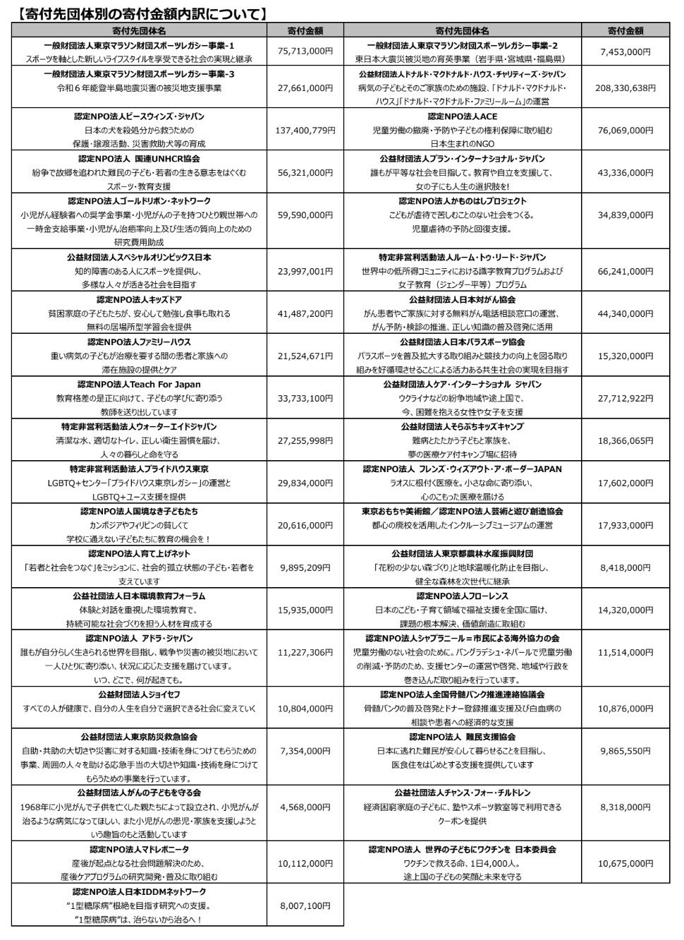 多くの皆さまから寄せられた温かいご支援により、東京マラソンチャリティは年々その規模を拡大しております。東京マラソン2026チャリティにおける各寄付先団体への寄付金額と、チャリティランナーの想いをご紹介いたします。