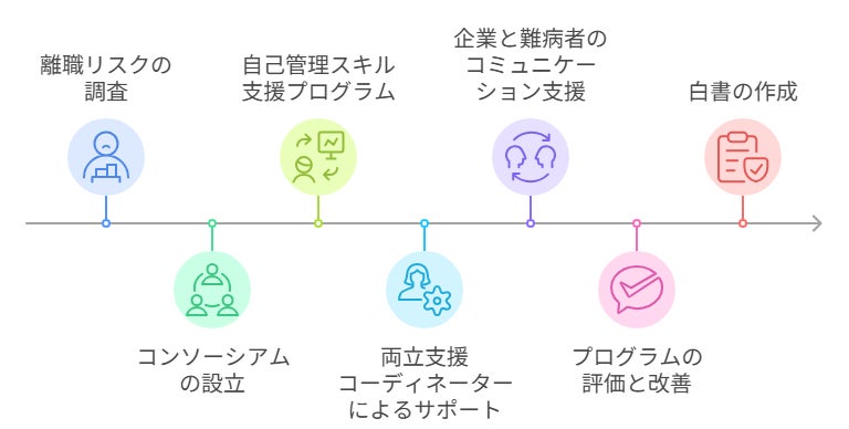 2) 企業間で「難病者の就労を考えるコンソーシアム」を設立し、課題や好事例を共有