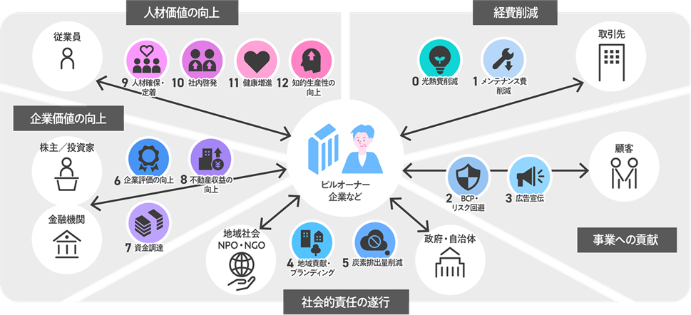 本ポータルサイトが提供する情報発信や各種機能を通じて、企業や自治体のGX/ESG経営の推進に加え、金融機関や投資家との対話・評価プロセスにおいても、NEBsが建物の省エネ化によって生まれる総合的な価値を適切に評価するための共通指標として活用されることをめざします。今後、本ポータルサイトでは、NEBsの社会実装を加速するため、計画立案から実装、さらには事後評価までの意思決定を総合的に支援していきます。