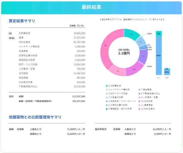 算定機能を使用し、省エネ機能を有するオフィス(新築、延床面積20,000㎡、収容人員3,000名、ZEB Oriented相当、RC 造)で試算したところ(図1)、NEBs効果額は約1.9億円/年、EBとNEBsをあわせた効果額は約2.1億円/年と算定されました。(図2)