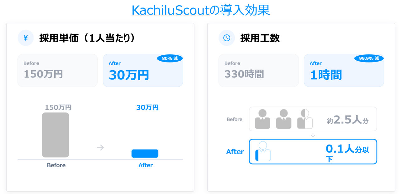 本サービスを導入することで、従来の採用プロセスと比較して採用単価・採用工数の大幅改善が見込めます。