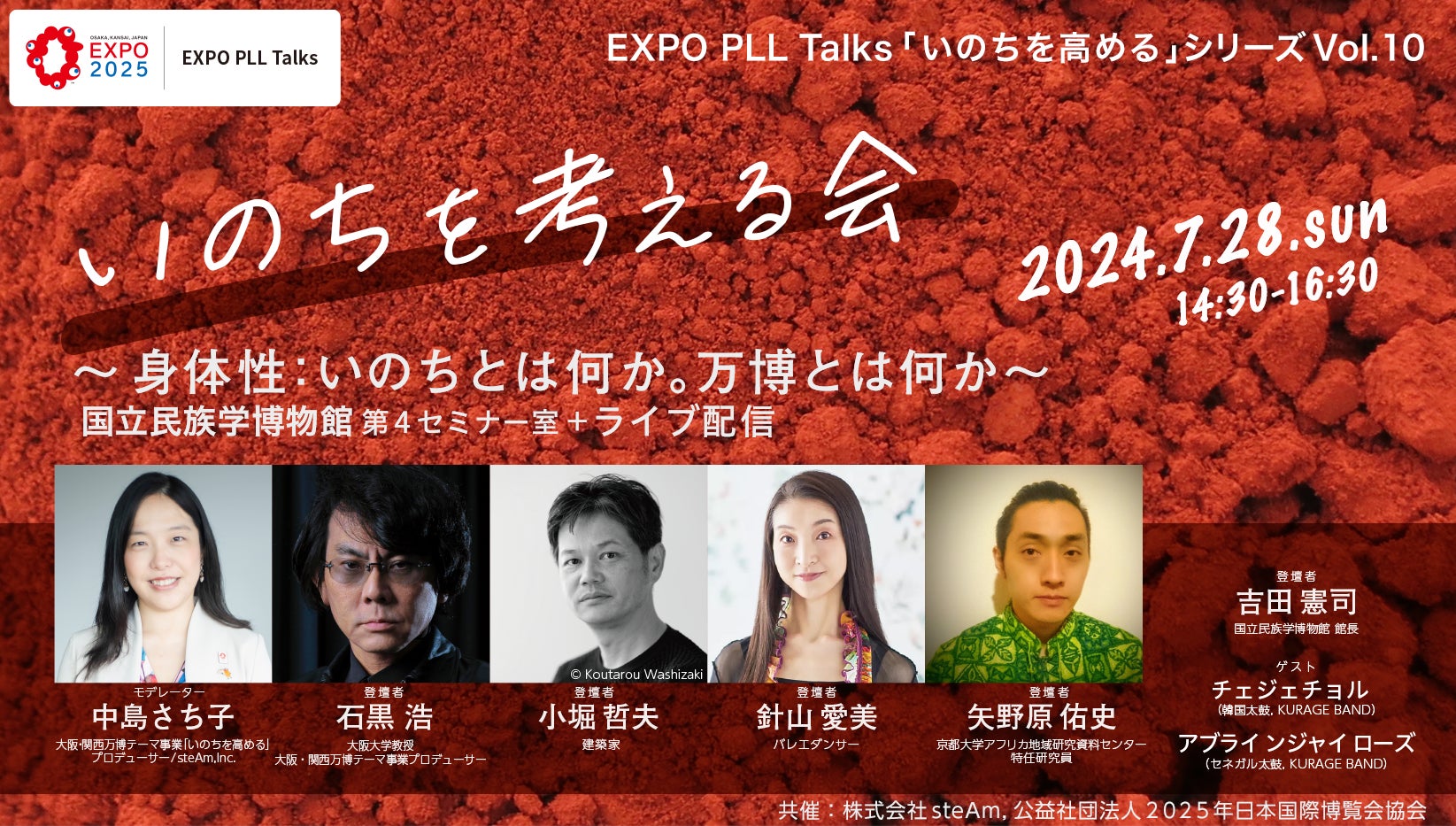 「いのちを考える会」初回は、2025年日本国際博覧会協会と共催するEXPO PLL Talks <いのちを高める>シリーズ vol. 10 として、中島と共に、国立民俗学博物館館長吉田憲司氏、万博テーマ事業プロデューサー・大阪大学教授の石黒浩氏、クラゲ館設計者・建築家小堀哲夫氏、バレエダンサー針山愛美氏、音楽人類学者の矢野原佑史氏、ゲストに音楽家・郷土芸能者チェジェチョル氏(韓国太鼓)、アブライ ンジャイ ローズ氏(セネガル太鼓)を迎え、”身体性”を基軸に「いのち」や「万博」の本質を深く問い直します。