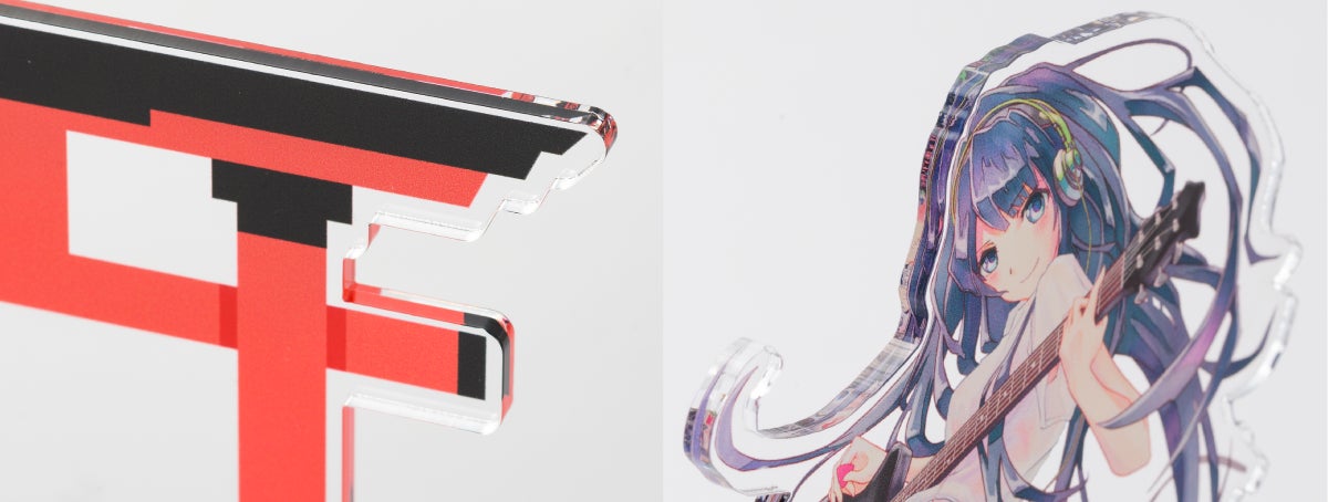 当社のアクリルフィギュア印刷は高画質な7色(CMYKの4色にライトシアン、ライトマゼンタ、ライトブラックを加えた印刷)印刷で、鮮明かつ濃厚な仕上がりです。また、アクリルの切り口は「アイスメルトカット」と呼ばれるレーザーカット方式で、つるつるとした滑らかな断面が特長。