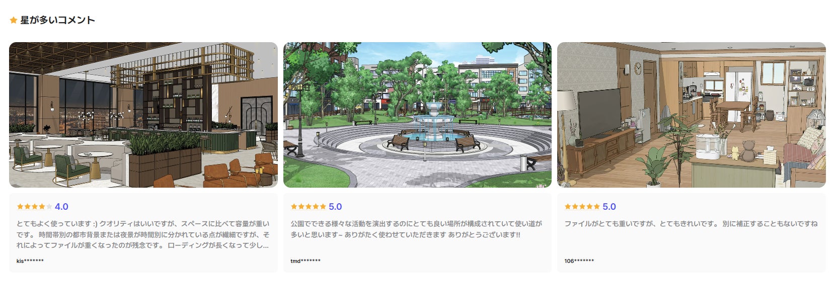 ジャンルタブは、単に素材をジャンル別に分類して見せてくれるだけにはとどまりません。クリエイターたちがより良い選択をできるよう、該当ジャンルに合う素材を勧め、点数の高い素材や実際のコメントも表示します。