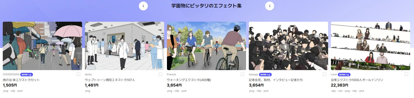 この度追加されたジャンルタブは、素材をジャンル別に見ることのできる空間で、クリエイターたちが自分の作品に合う素材を速く簡単に見つけられるように設計されました。ACONホームページ上部にあるメニューからすぐにアクセスできるジャンルタブは、現在人気のあるジャンルを中心に構成されており、下記のように5種類のジャンルを提供しています。