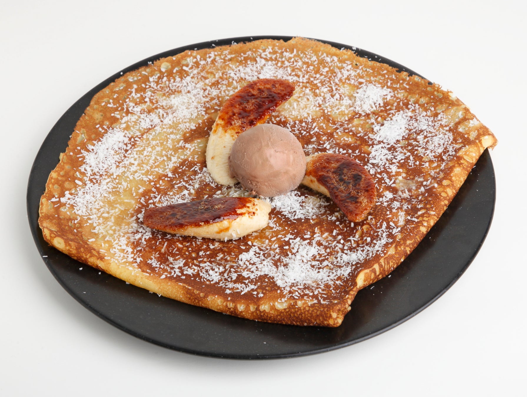 コクのある甘さと食感が特徴の甘熟王バナナを香ばしくキャラメリゼしました。ココナッツパッションフルーツのソースとローストしたココナッツファイン、チョコレートアイスを合わせたクレープです。バナナの甘さを活かした、このフェアだけの特別な一皿をお楽しみください。