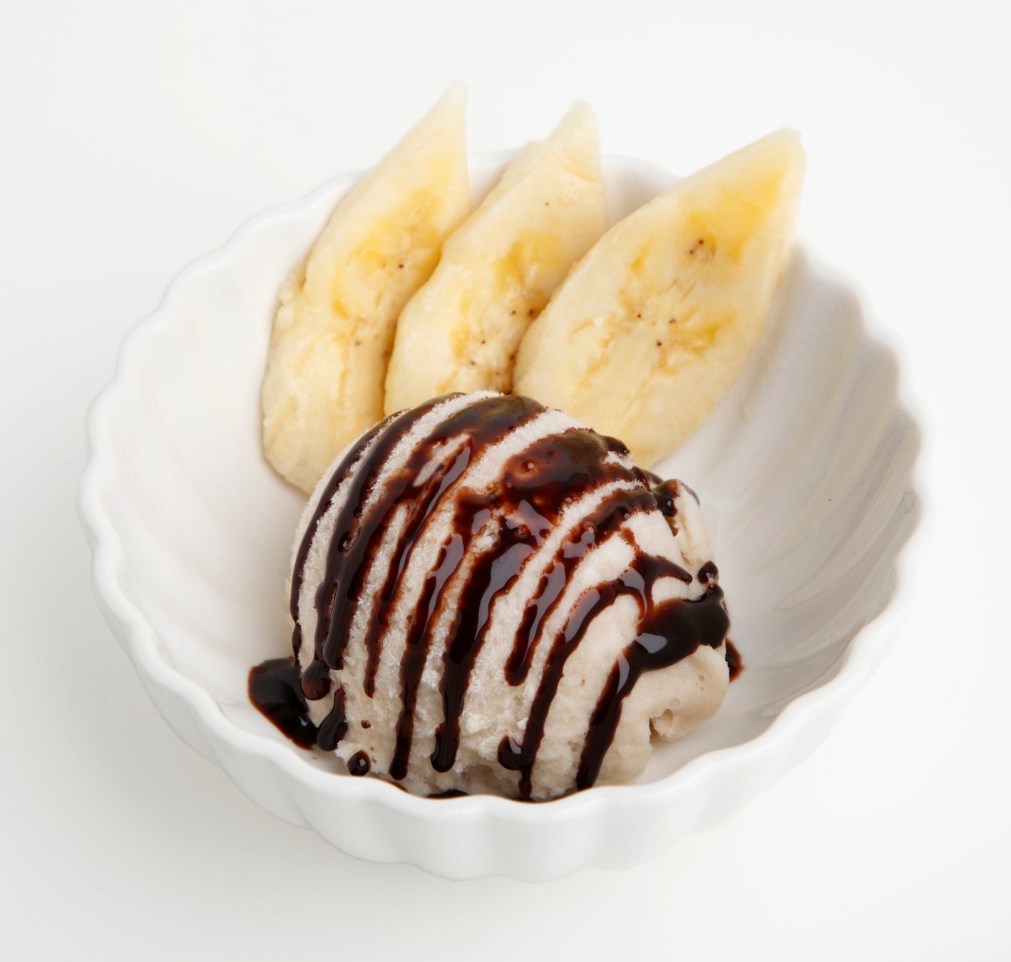 甘熟王バナナを練り込んだバニラアイスに、チョコレートソースをトッピングしました。添えたスライスバナナと一緒に召し上がっていただくと、甘熟王バナナの甘みをよりしっかりと感じていただけます。