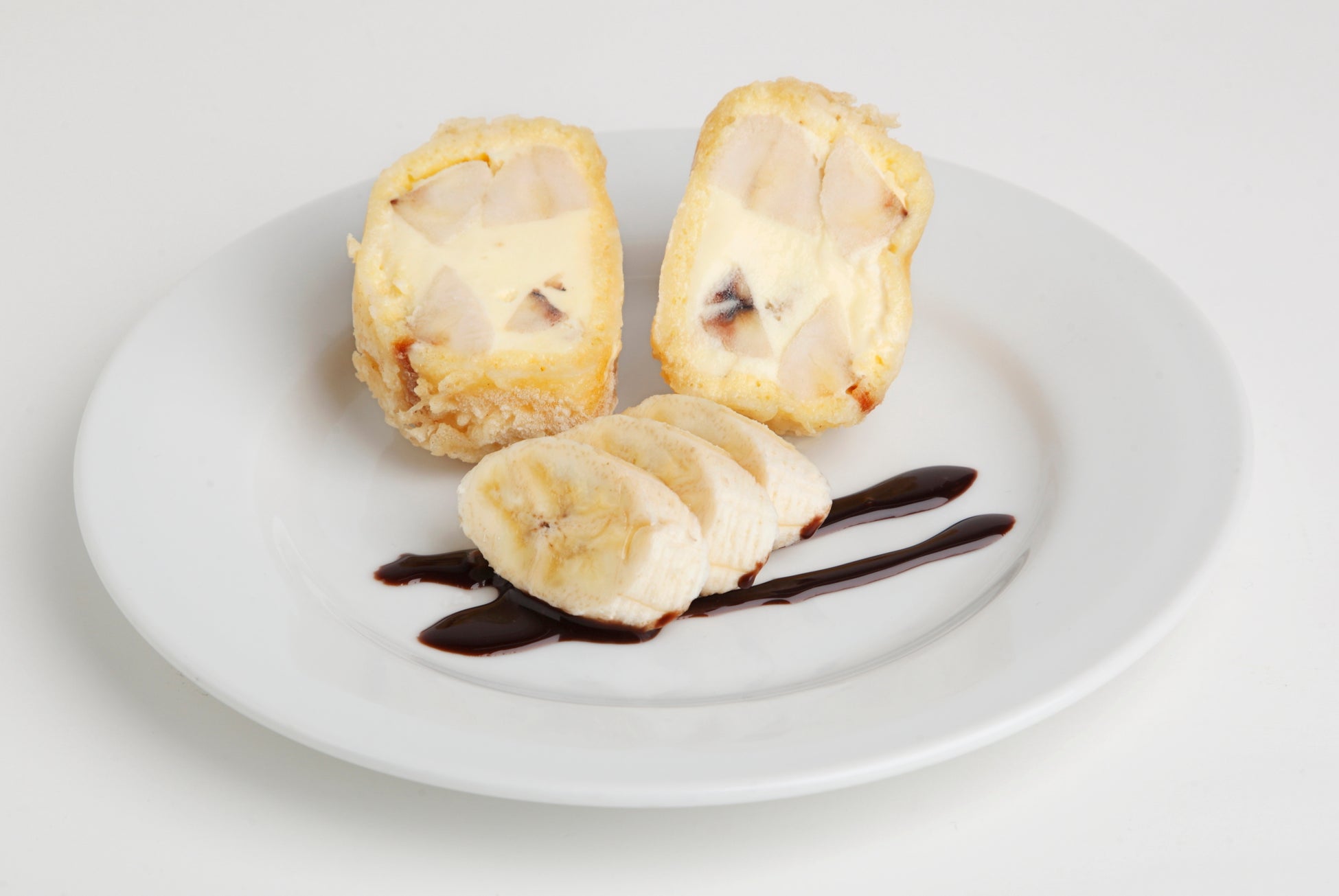 当店名物のアイスクリーム天ぷら。今回は甘熟王バナナを練り込んだアイスクリームで作りました。相性抜群のチョコレートソースと、スライスバナナも一緒に楽しんでいただけるデザートです。
