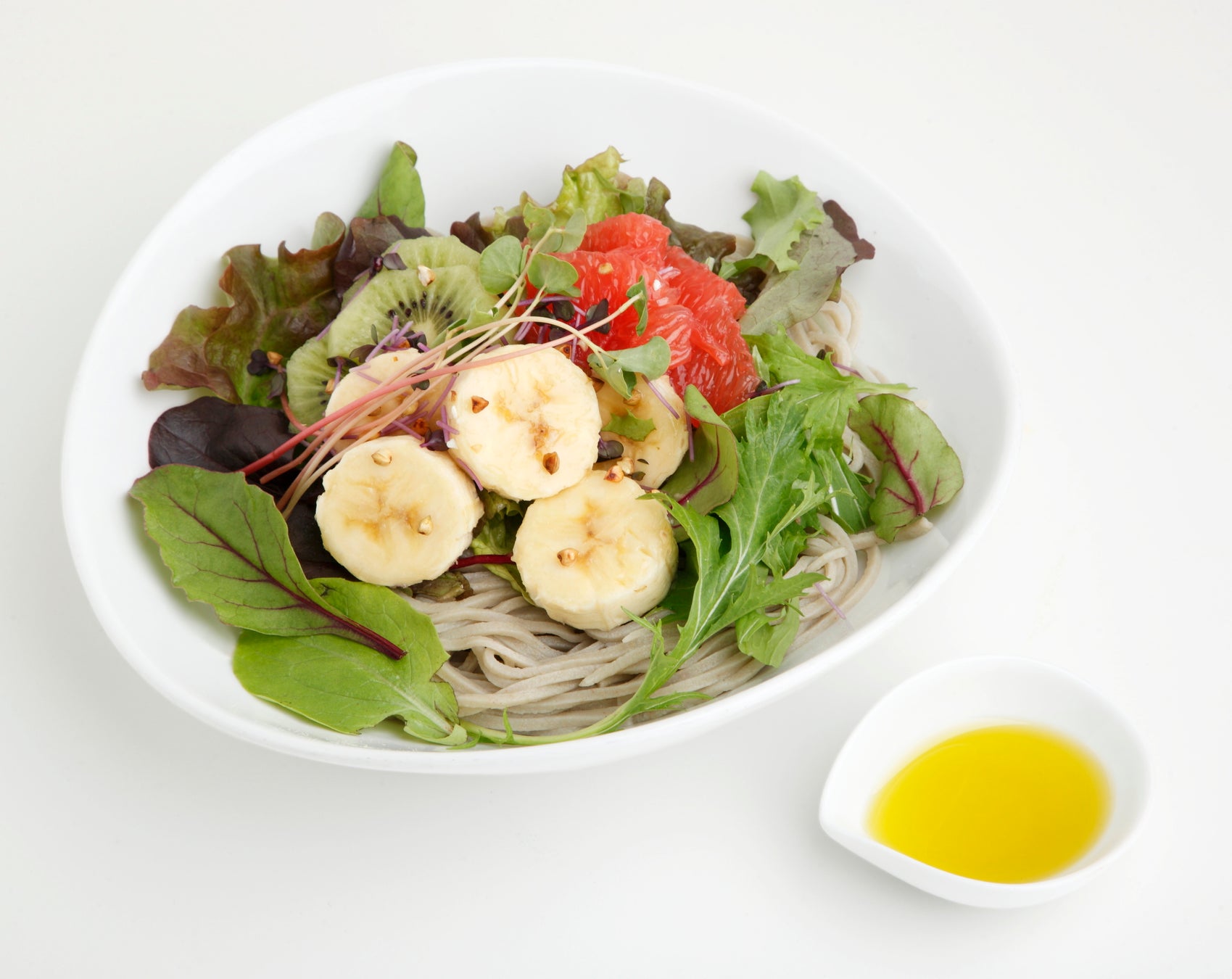 甘熟王バナナ、キウイ、ピンクグレープフルーツを添えたフルーツサラダを、お蕎麦と一緒に盛り