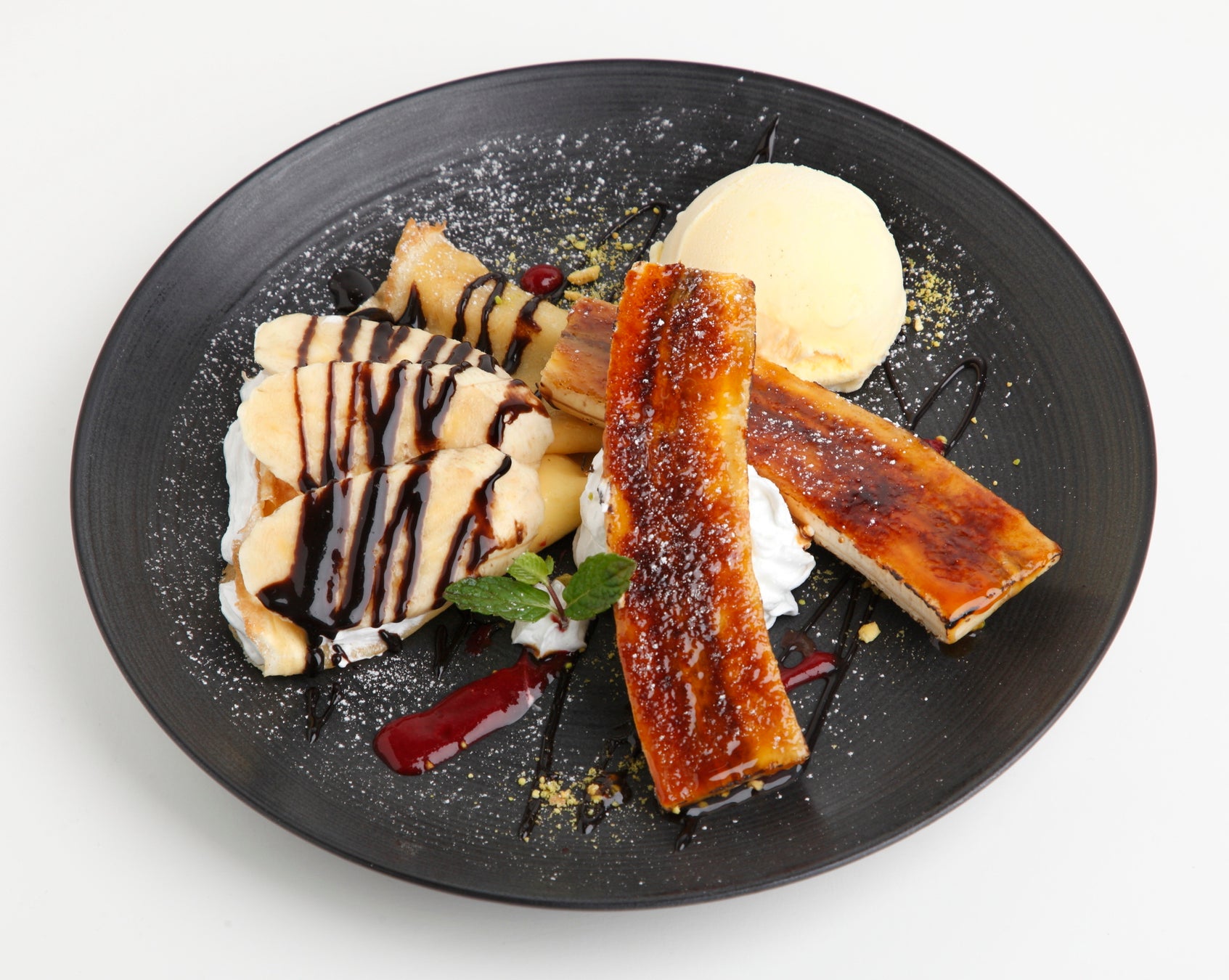 香ばしくキャラメリゼした甘熟王バナナと手作りクレープに、バニラアイスを添えました。スライスバナナやチョコソースと共に召し上がってください。甘酸っぱいフランボワーズソースとピスタチオパウダーがアクセントになった香りも楽しめる一皿です。