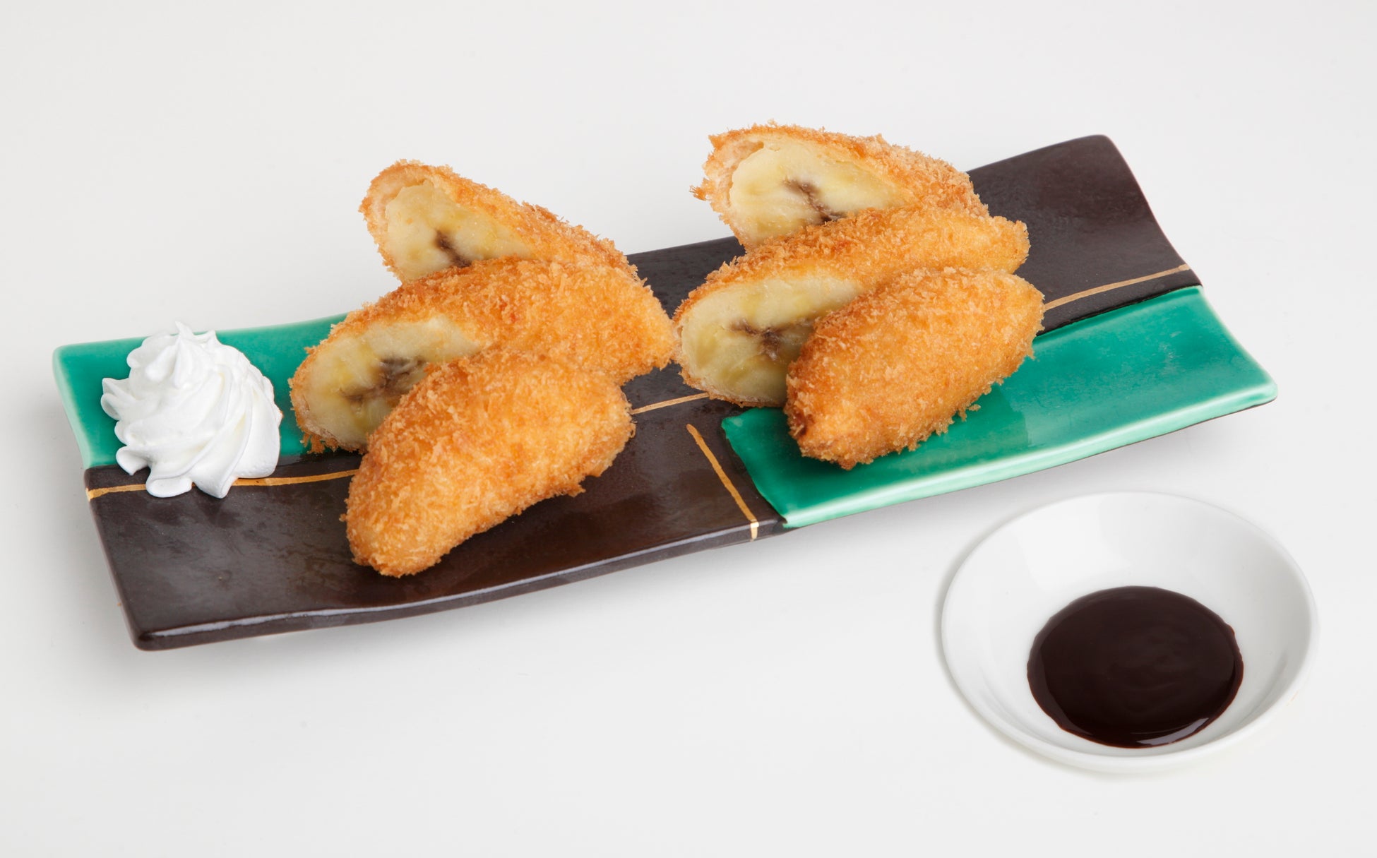 甘みがギュッと詰まった甘熟王バナナを、当店自慢のパン粉で包んで揚げました。ホイップクリームと、別添えのチョコレートソースをつけて召し上がってください。