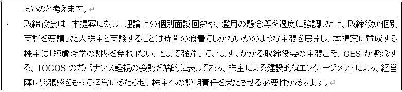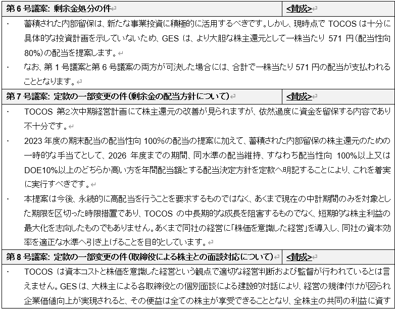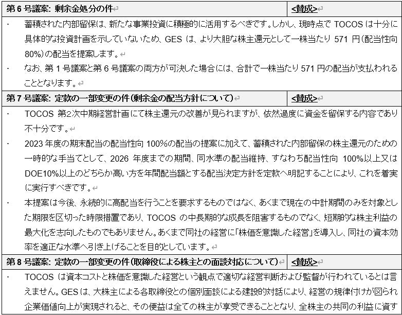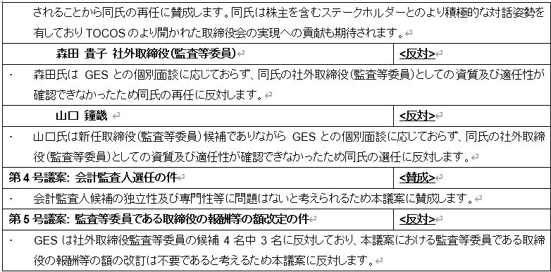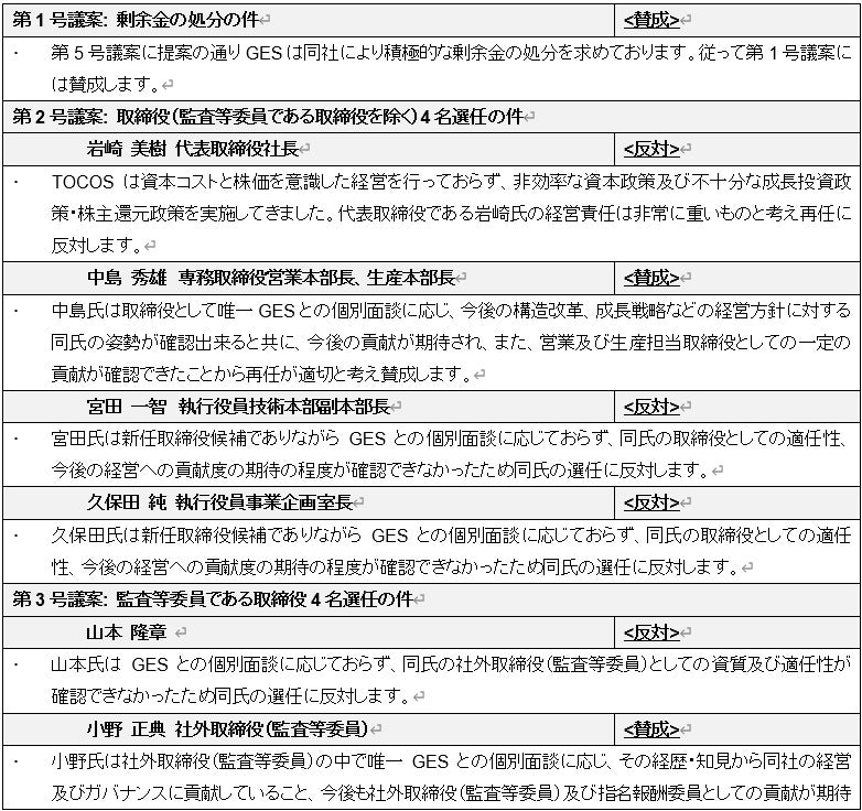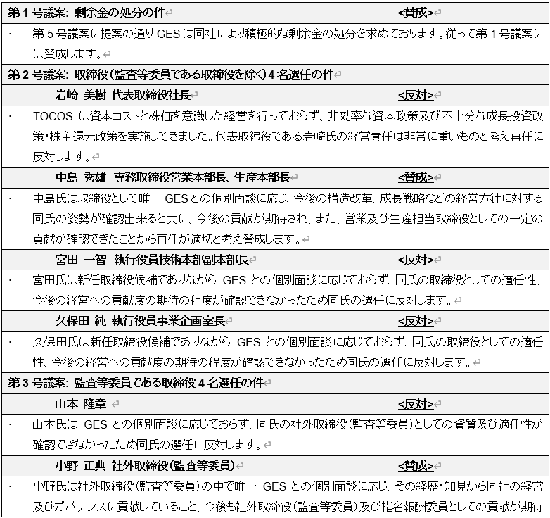 GESはTOCOSの大株主としての責任を果たすため、またGESの出資者に対する説明責任を果たすため、上記の通り議決権を行使する方針を決定致しました。GESは引き続きTOCOS経営陣との建設的な対話及び株主としての責任である必要に応じた株主提案、議決権行使を通じて同社の企業価値及び株式価値の最大化を目指して参ります。