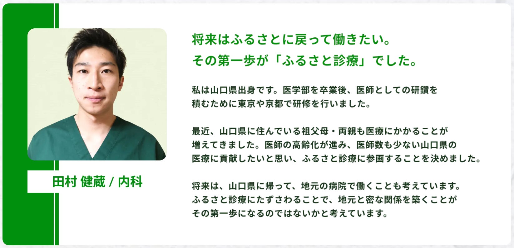岩国市の取り組みにおいても、「ふるさと診療ドクター」が診療を担当しており、地域外に住みながらも「ふるさと」を身近に感じながら、山口県に貢献する仕組みとして機能しています。さらに、防府市、岩国市の両事例で診療報酬や患者情報が地域医療機関に紐づくため、地域医療の経済循環にも配慮された構造となっており、持続可能な地域医療の実現に貢献しています。