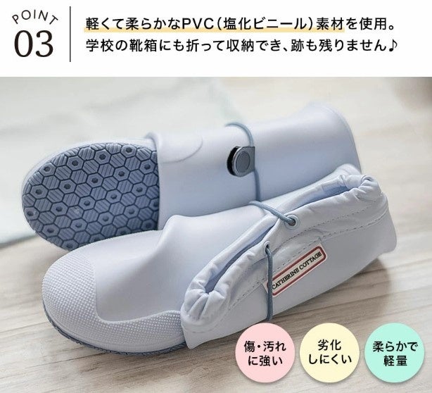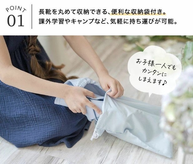軽くてやわらかなPVCを使ったレインブーツは、丸めても跡になりにくく、収納袋にコンパクトに収納可能。旅行や学校行事などの荷物にも入れられて、持ち運びにも便利です。