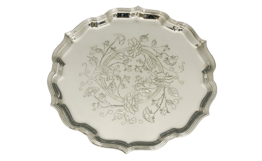 この銀盆には、銀細工のあらゆる伝統技術が集結しています。一枚の銀の板をハンドプレスし、その周りに細やかな銀の装飾を取り付け、さらに表面が滑らかになるよう美しく磨き上げる。どの工程にも高い技術が求められるため、現在、日本でも限られた銀師にしか銀盆を作ることはできません。