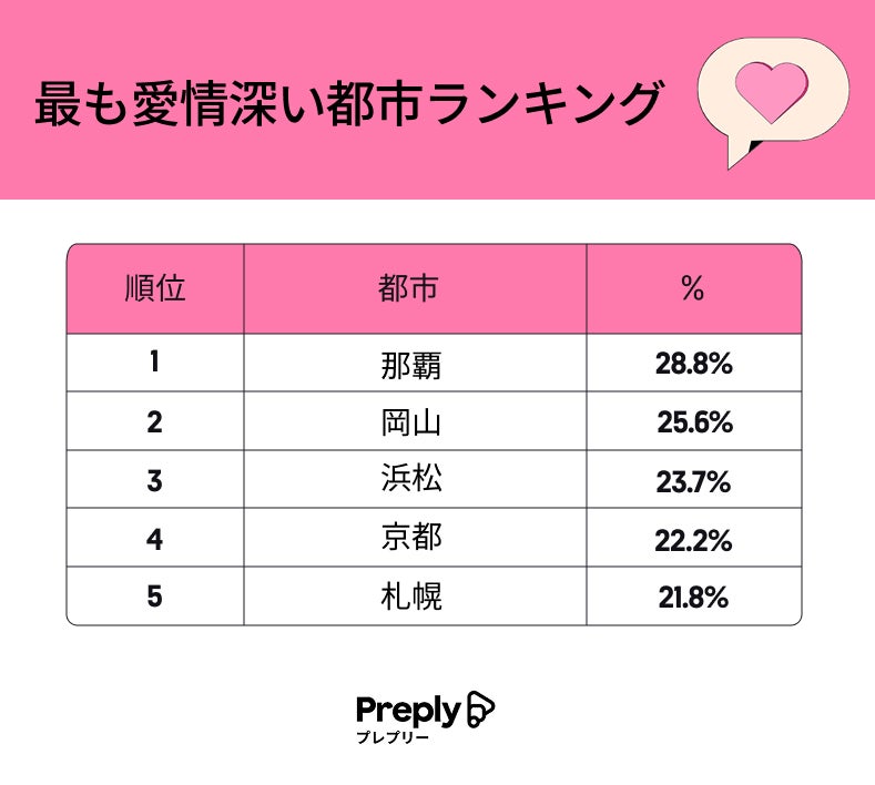 日本で最も愛情深い都市は那覇(28.8%)という結果になり、続いて岡山(25.6%)、浜松(23.7%)が2位と3位にランクインしました。