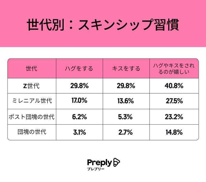 調査結果によると、Z世代の29.9%が「ハグをする」「キスをする」と回答し、他の世代に比べて高い割合でした。また、40.8%が「ハグやキスを受け取るのが嬉しい」と答えていて、これは他の世代と比較してダントツで高く、スキンシップへの肯定感が強い傾向にあることが分かりました。