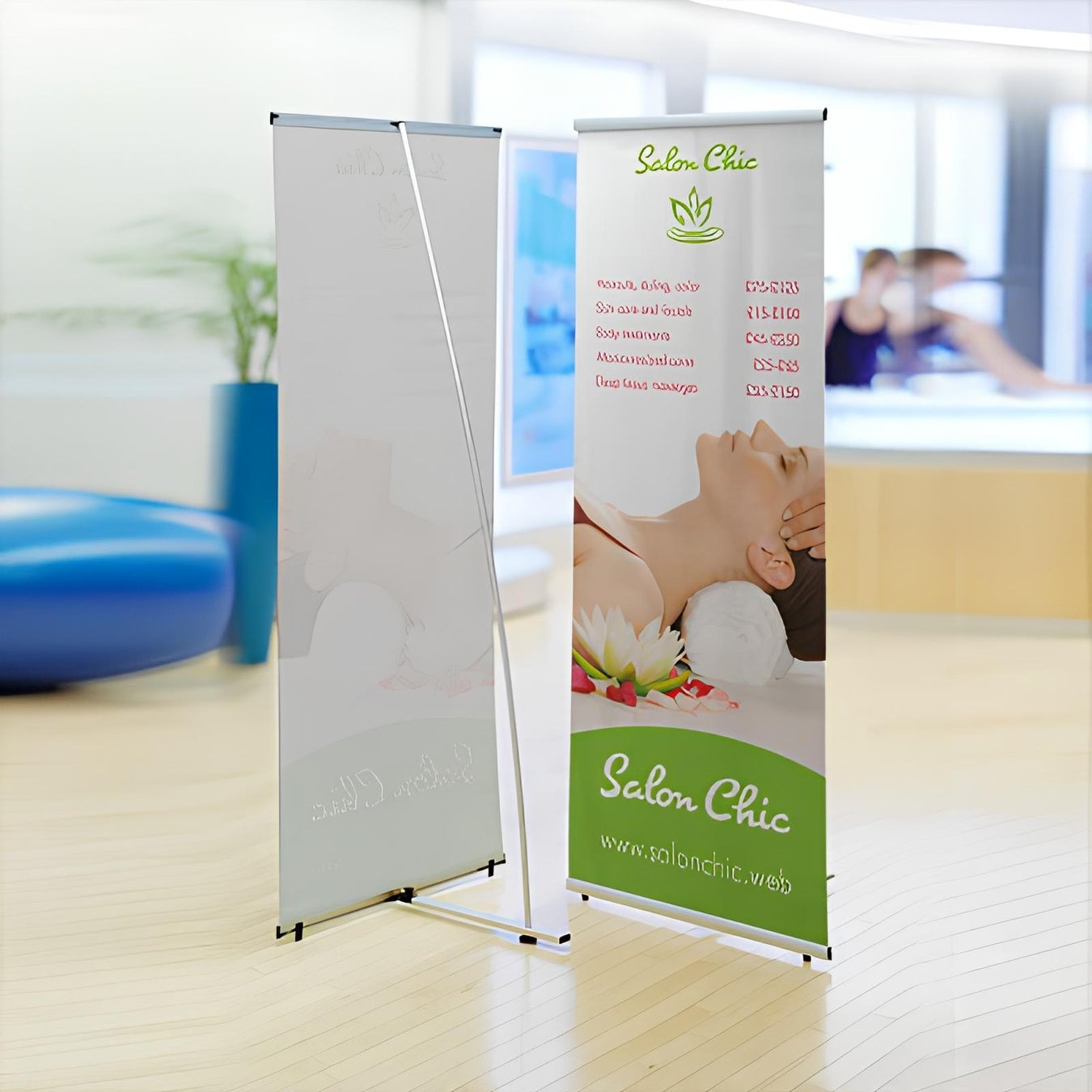 シンプルなL型バナースタンド。軽量設計でメディア部分をハンガーに挟んで取り付けるだけ。簡単に印刷面を取り替えることができます。