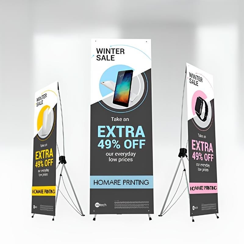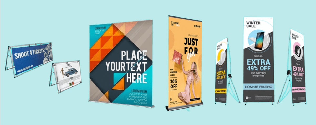 屋外・屋内で使用可能。スポーツ観戦やイベント等に最適な大型のバナースタンドです。大と小の2タイプから選択できます。