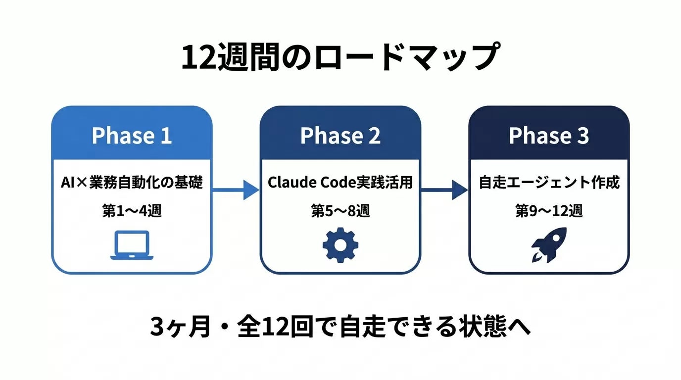 基礎 → 実践 → 自走の3フェーズで着実にスキルを積み上げます。最終回には自社専用AIエージェントを構築します。